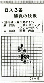 と、白12までと打ったとき、「ここ(A)に打つとハマルからね」と、スンドリング四段はニヤリ。いま流行の大井耕三四段発見の後手策は、早くもスウェーデンに渡っているのを知るのである。