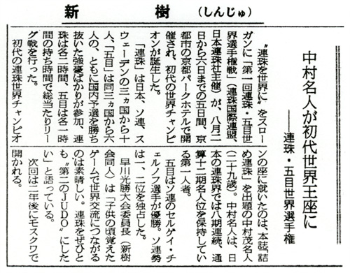 前回は夢の実現となった「第1回連珠世界選手権京都大会」のもようを京都新聞の報道を中心に報告したが、今回は他紙をまとめて一挙に掲載することにいたします。