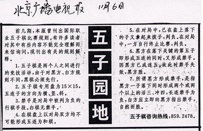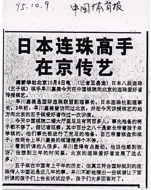 日本では五目並べに対して正式な呼び方は連珠である。正式の段位制度もある。日本の棋手は世界タイトルマッチで三回連続してチャンピオンを獲得したことがある。今回“中国棋院”の招きで、日本の連珠名人ー九段の三森政男さん、八段の早川嘉美さんと相原寛さん等が北京で国際で通用する連珠の試合規則とそれなりの技術を伝授することになった。北京の二百人あまりの連珠ファンが興味深く受講した。