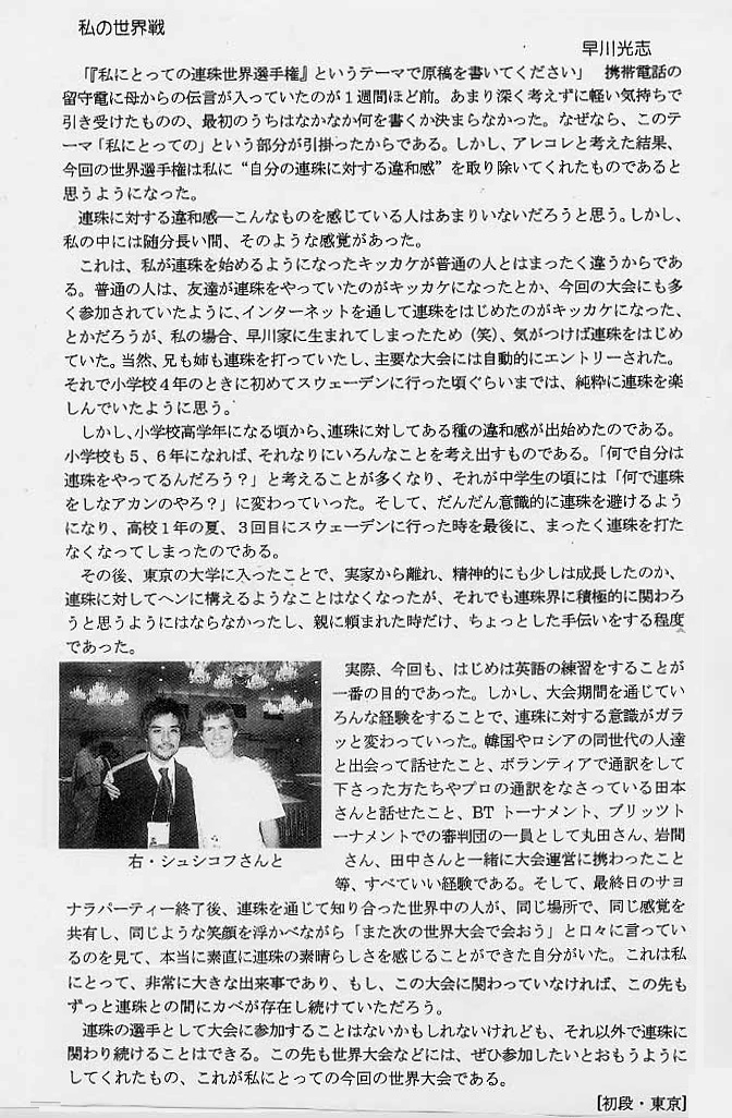 そのあとにこれも報告誌に掲載された私の家族の大会始末記を紹介して結びとさせていただくことにしたい。これがもっとも端的な私ども家族が連珠とかかわりであった総括のように思うからである。
