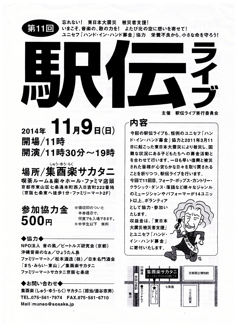 間もなく開催する「第8回おにんぎょう大好き展」「はやかわよしみ水彩画展」の会場となるのが、 集酉楽サカタニですが、集酉楽サカタニでは恒例となった「駅伝ライブ」(第11回)が今年も14ユニット、 100名を超える出演でにぎわいます。